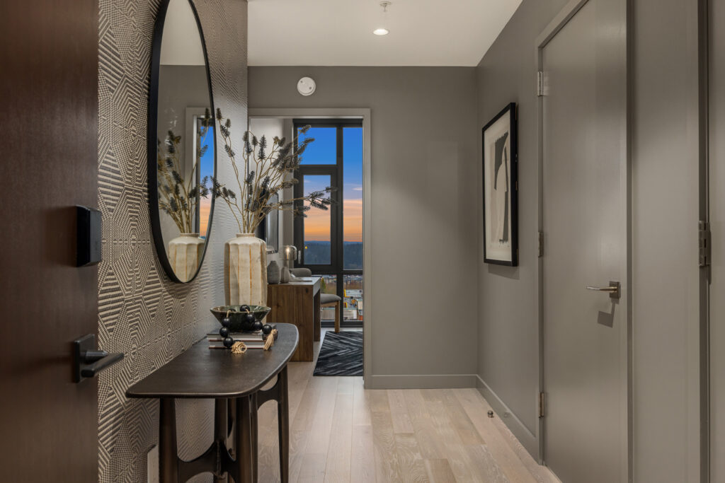 Drawing inspiration from The Avenue Roastery cocktail created by InterContinental Seattle Bellevue’s mixologist Marie Yoshimizu for a past Avenue Bellevue event, local designer Tara Nelson created a home in The Residences Tower #1410 with bold yet relatable appeal. The entry features black-and-tan geometric wallpaper and sculptural lighting for a lounge-like first impression. Expansive windows balance the dark palette with natural light. A second bedroom doubles as a refined home office, while the primary bedroom layers textiles and tonal depth for a hotel-worthy retreat. Finished with signature Avenue Bellevue kitchens and baths. The unit is fully furnished and available to tour.